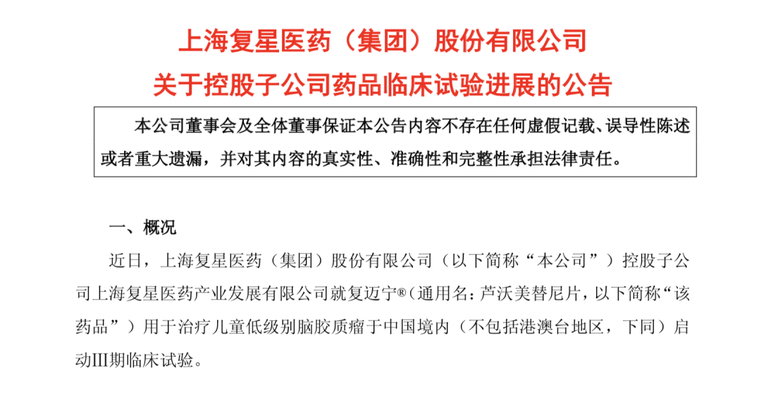 中国首款!复迈宁启动III期临床试验 治疗儿童低级别脑胶质瘤