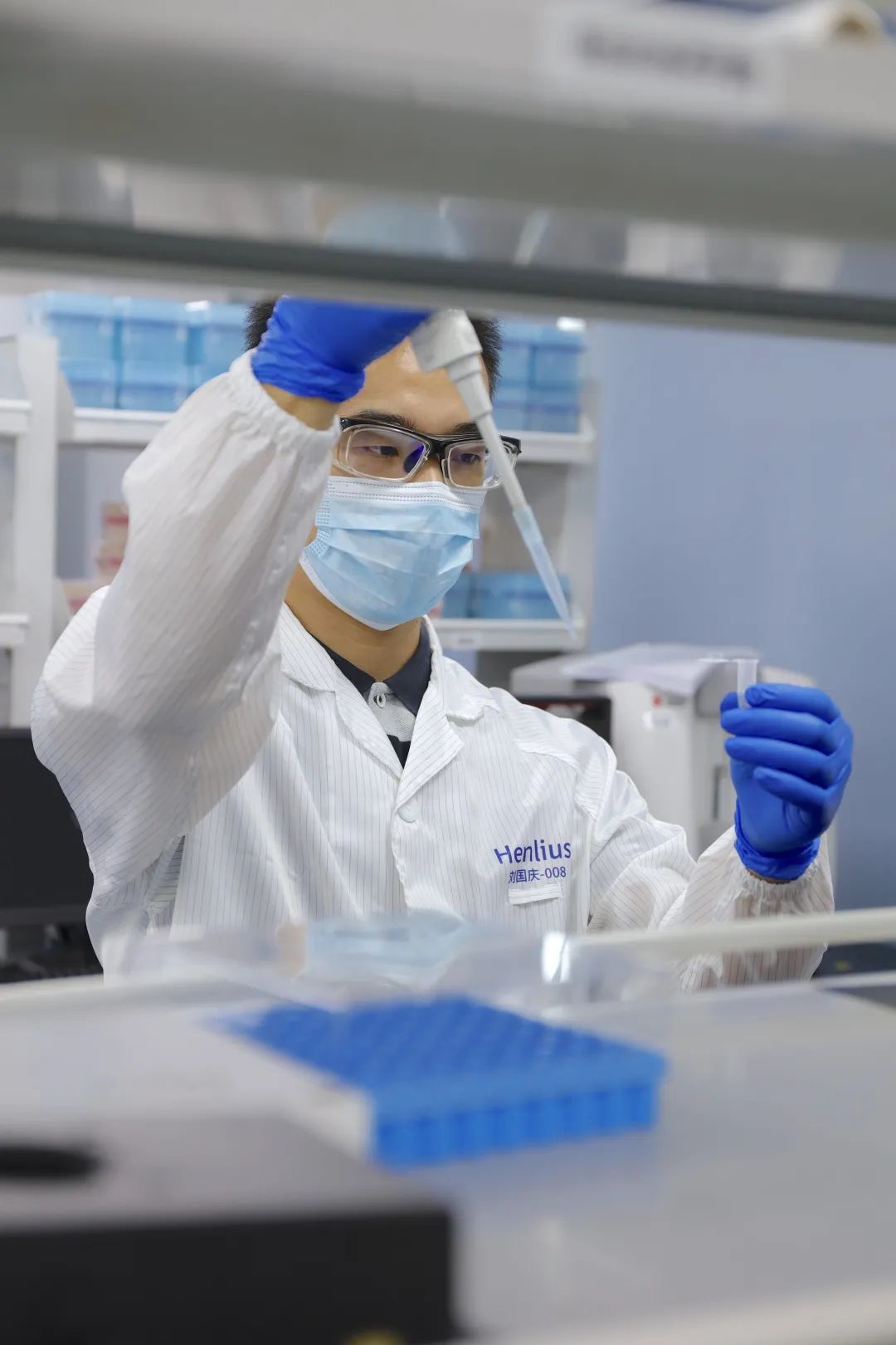 作为涌动人群中的一员,刘国庆拉开C楼实验区的金属衣柜,熟练地找到标有自己名字与工号的白色实验服,穿上实验鞋,戴上护目镜,也开始了“上班打卡”的规定动作。