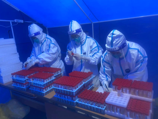三人组成党员“铁三角”,和同事孙禾、苏嘉媛、张贺峰、张路明一起根据各自专长明确分工。从样本接收、分类编号,到转运送检、提取核酸、扩增检测,再到录入结果、上传健康云,最后是收集并消杀处理医疗废弃物,连日来,一队人马全流程参与到检测所的紧张工作中。