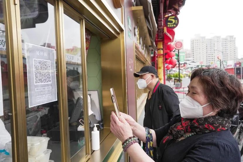 顾客在外卖档口前扫场所码
