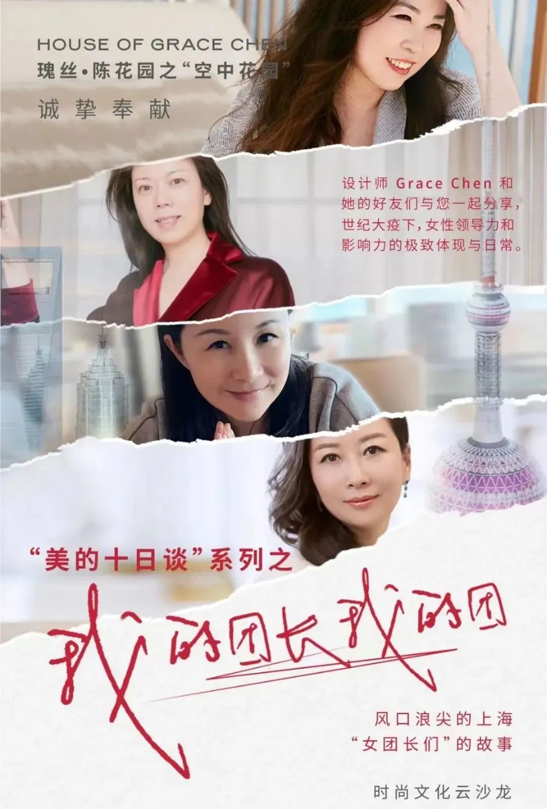 GRACE CHEN在疫情初,就开始举办“空中花园”之“美的十日谈”和“追忆流水年华”这两大主题的时尚艺术云沙龙,分享GC girls的居家抗疫心路历程和美好有趣的时尚话题。在疫情防控最紧张的时候,云沙龙中聆听“女团长们”的娓娓道来——她们在事业上是创始人是管理者,在生活中是温柔幸福的母亲,在疫情中又主动挑起“团长”的担子。她们把对工作的严谨和生活的激情融入到解决团购的大大小小问题中去,比如在忙乱繁琐的团购沟通中也要“拗出生活造型”的弘衍阅读创始人张雁,寻找供应商也要有“Plan B”的蝶亿时尚集团创始人王陵,还有“无心插柳柳成荫”的史带财险董事长董颖,担任“团长”展现她们“刚柔并济”的女子力。