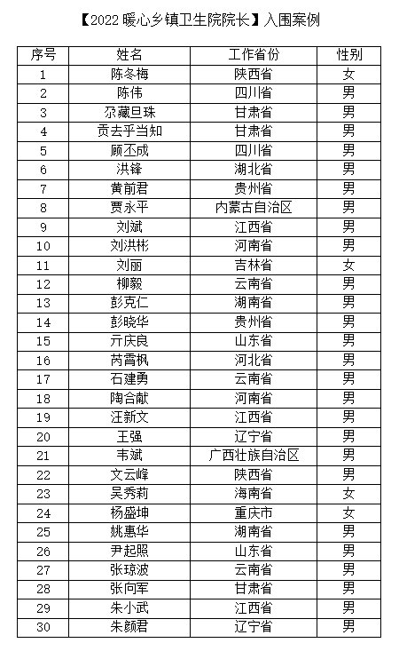 主办方组建了由国家卫生健康委卫生发展研究中心、中国家庭医生平台、中国社区卫生协会、中国医学科学院医学信息研究所等10位专家组成的评审团队,并通过中国青年报·中青在线评审系统进行线上评审。最终评审出25个优秀案例,其中暖心乡村医生优秀案例10个、暖心乡镇卫生院院长优秀案例10个、青年榜样优秀案例5个;评审出70个入围案例,其中暖心乡村医生入围案例30个、暖心乡镇卫生院院长入围案例30个、青年榜样入围案例10个。