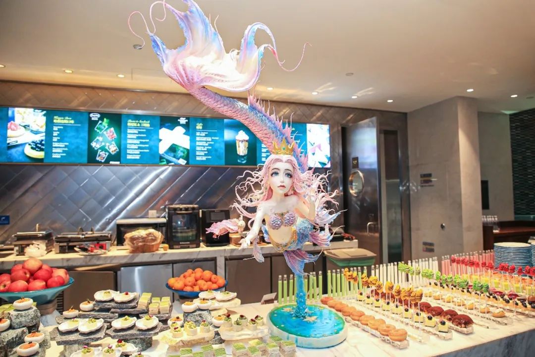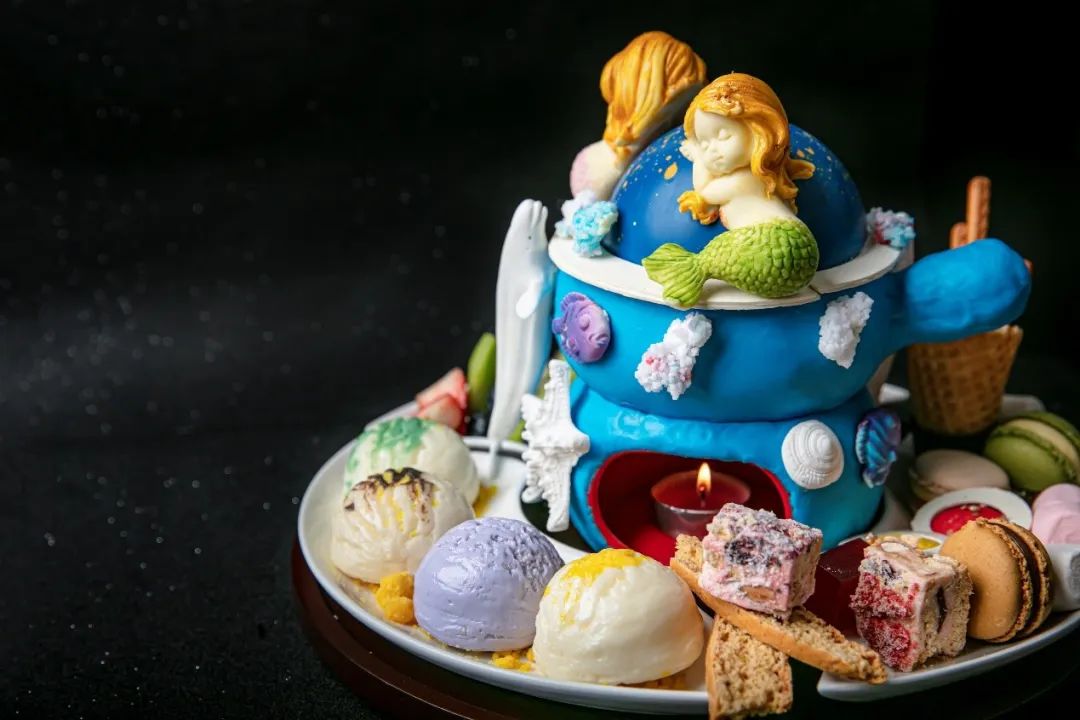 2021年12月,首届中国美人鱼表演赛在三亚·亚特兰蒂斯大使环礁湖成功举办,这也是度假区首次承接国家级赛事。为此,马师傅与西饼房团队历经半个月的时间,倾力打造了一个高度约50厘米的大型美人鱼翻糖蛋糕。“巧夺天工,美轮美奂”,这是所有人第一次看到作品的评价,生动传神地展现出美人鱼的梦幻唯美,甚至连头发的细节之处都处理得尤为真实。