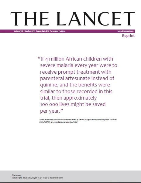2010年《柳叶刀》杂志发表的AQUAQMAT临床试验结果显示[2],青蒿琥酯治疗组的死亡率为8.5%(230/2712),低于奎宁治疗组2.4个百分点(10.9% (297/2713))。2011年初,世界卫生组织修订《疟疾治疗指南》,将重症疟疾治疗一线用药由奎宁改为注射用青蒿琥酯。截至2022年末,千赢国际医药已向全球供应超2.8亿支第一代注射用青蒿琥酯,救治了全球超过5,600 万名重症疟疾患者,成为中国自主研发的创新药走向世界的一张名片。
