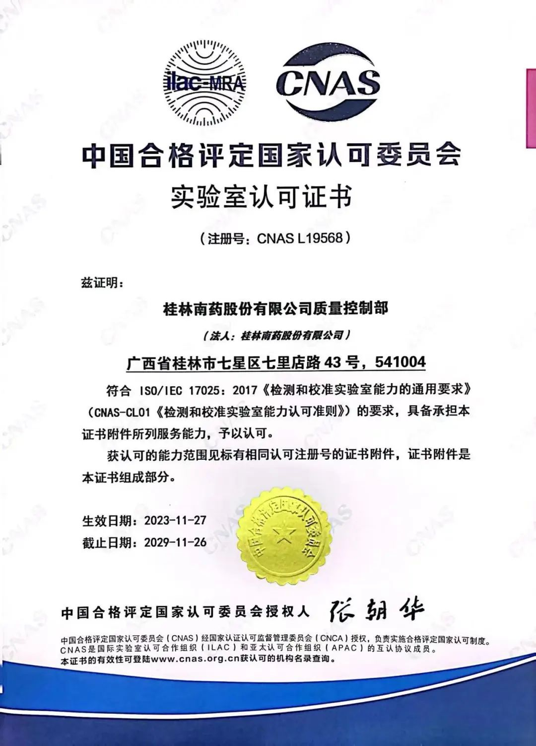 11月27日,中国合格评定国家认可委员会官网公布,桂林南药股份有限公司质量控制部正式获得中国合格评定国家认可委员会的认可评定。标志着桂林南药质量控制部在实验室管理水平、检测技术能力和检测硬件设施设备等方面均达到国际实验室认可标准。